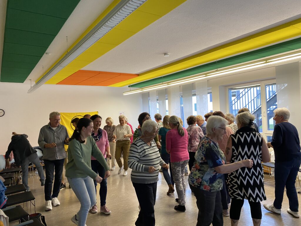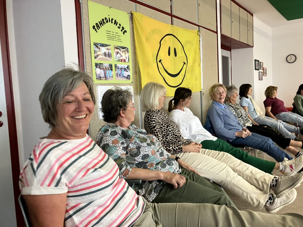 Elemente zum Glücklich sein beitragen: Spielen, Tanzen, Singen und Lachen. Mit dem Tanz „Arthrose Ex“ zu dem Lied von Peter Alexander „Steck dir die Sorgen an den Hut“ wurde eingangs getanzt gelacht und Klatschübungen dazu gemacht. Die Kursleiterin erklärte weiter, dass ein Lächeln im